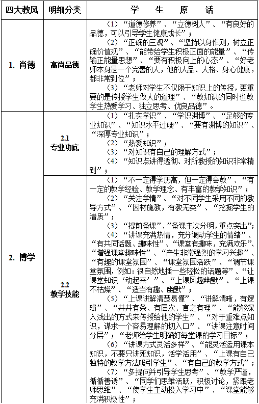 尽管学生们的反馈意见各式各样、各有侧重,但通过细心比对和归类,发现他们的意见几乎均体现了湘信院的“教风”——尚德(Sublime Virtue)、博学(Great Erudition)、敬业(Enormous Dedication)、大爱(Universal Love)(见《湘信曼志》2022年9月版次第18页)。有鉴于此,本文将从以上四个方面来呈现湘信学子心目中的“好老师”与“好课堂”,详情请见下表。