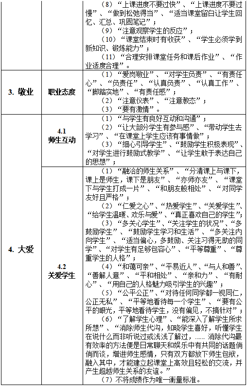 考虑到文章篇幅已大为超出,关于“大爱”这个部分的例证将不再赘述。大家不难发现:学生们对老师“关爱学生”特别看重,请参阅上面表中的相应条目!必须说明一下:(1)在上表中的“学生原话”部分,并列的各项条目未必一定是同级关系,也可能有部分包含关系,但是为了避免分类过于繁复,暂不再增添下级细目加以区分。(2)有些归类可能仁者见仁智者见智,幸好这样模糊“跨界”的例子比较少,现仅举一例:“多鼓励学生”,如果学生指的是教学中多鼓励引导学生,倒可以归在“2.2教学技能”中,但如果鼓励出现在师生互动环节,好像放在“4.1师生互动”中也行,所以要看场合和语境来确定。如果学生只单独反馈“多鼓励”,本文作者咨询了学生们的意见,大部分人认为在这种语境不清楚的情况归在“4.2关爱学生”中比较合适。如果您对上表中的归类有疑议或有更恰当的分类,烦请告知,万分感谢!