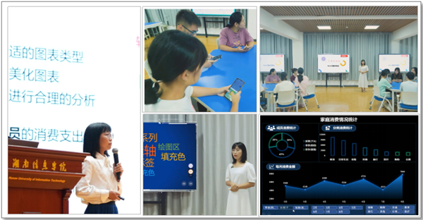 以“Excel数据可视化”为例,活动小组借鉴线上优秀案例,分析案例的设计要点,进行优化与创新,完成了家庭支出数据看板的制作。整个小组任务需要综合运用透视表、切片器、图表设计、样式等知识点,课堂学习气氛热烈,达到了较好的教学效果。该课程在全校进行了信息化课堂教学示范,黎大志校长对此教学进行了点评并予以充分肯定,同时,也得到了全校教师的一致好评。