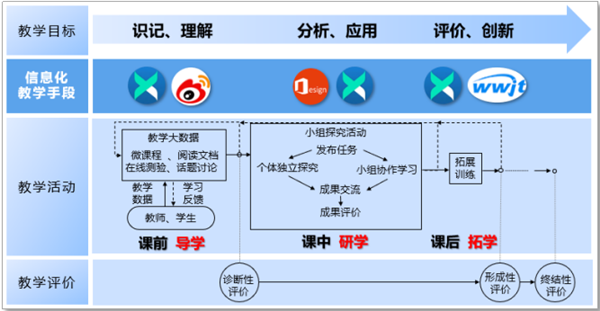 针对已有的“线上+线下”双线混合教学进行创新,探索“线上教学”与“线下教学”的融合与融通,使两者相辅相成,构建了“导学——研学——拓学”三学进阶式教学模式,更好地促进学生的学习。
